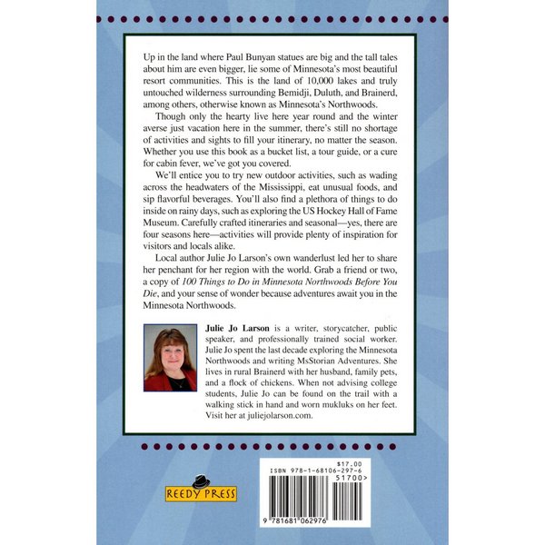 "Local author Julie Jo Larson's own wanderlust led her to share her penchant for her hometown with the world. Grab a friend or two, a copy of 100 Things to Do in Minnesota Northwoods Before You Die, and your sense of wonder because adventures await you in the Minnesota Northwoods."