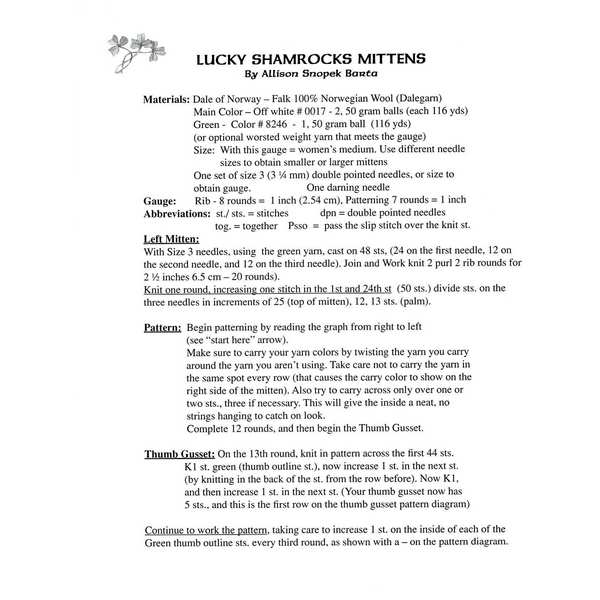 The Lucky Shamrocks Mittens by Allison Snopek Banta is a beautifully designed pattern that combines the warmth of Norwegian wool with the charm of an intricate shamrock design. This pattern, using Dale of Norway - Falk 100% Norwegian Wool, creates mittens in a women's medium size (with adjustments for larger or smaller sizes). The mittens feature a knit 2, purl 2 ribbing at the cuff, and the shamrock pattern is created with green yarn. The thumb gusset is carefully crafted with increases and a specific placement of stitches to ensure a comfortable fit. The pattern also includes detailed instructions on colorwork techniques, such as carrying yarn across rows, ensuring the inside of the mitten remains neat without loose ends. Perfect for those who enjoy a challenge and want to create something festive and cozy for the winter months.