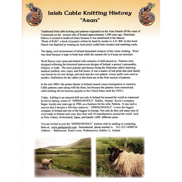 “Book of Kells”, a book of gospels written by hand by monks in A.D. 800. In this book Daniel was depicted as wearing an Aran jersey (cable knit sweater) and matching socks.