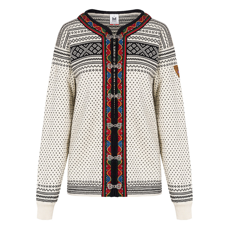 The authentic Dale of Norway look! The Setesdal design evokes history and memories; it is the most recognized Norwegian pattern and has been knitted for generations. The small v-shaped dots are known as the “lusekofta” (lice pattern), while the crosses were believed to protect from evil spirits. Details include authentic pewter clasps and an embroidered band that is identical to the original design that has been used for centuries, all made in Norway. This is a unisex style sweater. If purchasing for a woman, we suggest going down a size for optimum fit.