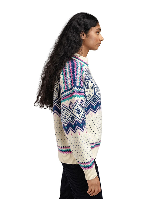 This is the official sweater for the 2025 Ski World Championships in Trondheim. A warm and comfortable wool sweater with a distinct retro touch, blending fresh colors with a classic expression. The pattern is inspired by the championship's values of diversity and inclusion, while drawing motifs from historical cultural landmarks in Trondheim. The sweater is knitted in 100% wool for long-lasting qualities and features a medium-high neck with a zipper.