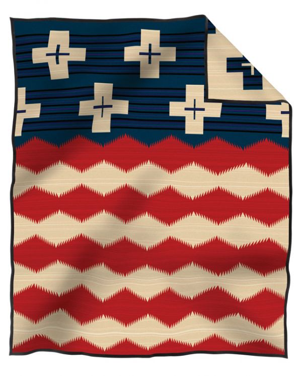 Contemporary interpretation of the American flag celebrates the patriotism of Native American soldiers. The design marries modern asymmetry and vintage Americana.