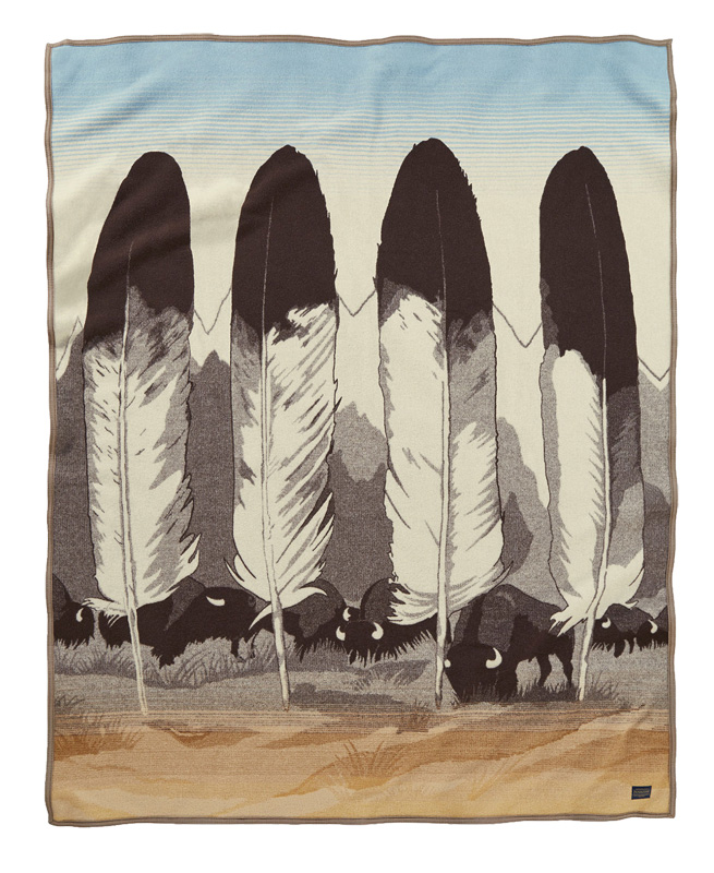 Created in partnership with Jemez Pueblo artist Joe Toledo, this USA-made wool blanket is a true work of art. A watercolor painting by the artist is rendered beautifully in pure virgin wool that’s been dyed, loomed with cotton and expertly woven in our Northwest mills. The design represents the three elements: Earth, Air and Water. A herd of bison grazes on the Earth, offering prosperity and protection. A range of mountains stands behind, their snowy peaks covered with life-giving Water. Standing eagle feathers rise into the sky, joining together Earth, Water and Air.
