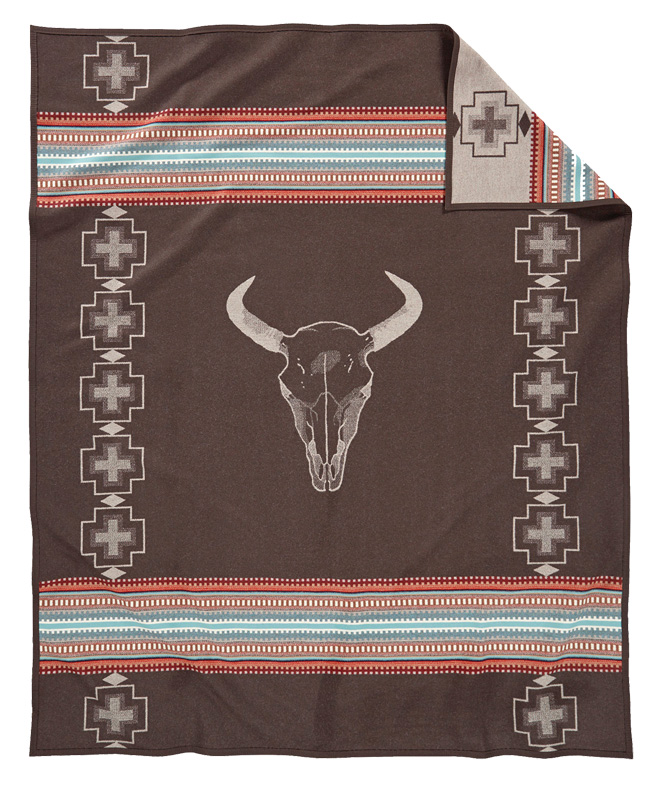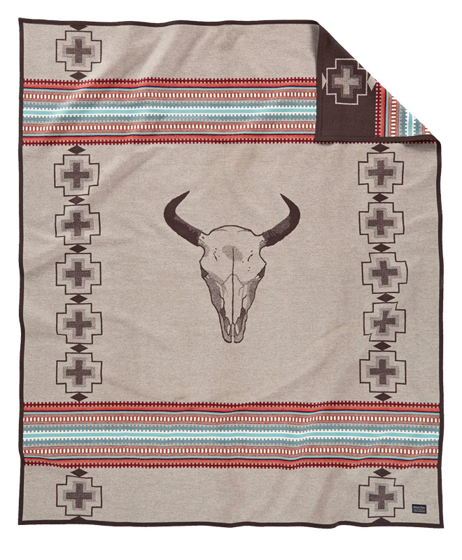 The American West is home to trading posts and pueblos where skilled artisans create treasures using the natural materials around them. This blanket’s geometric borders echo the patterns found in weaving and stamped silver jewelry. Colorful bands of turquoise, coral and opal are a tribute to the semi-precious stones used in many Southwestern works of art. A bleached bison skull at the center serves as a reminder of the power and endurance of this dry and beautiful landscape that blooms with creativity. Reverses for two dramatically different looks.