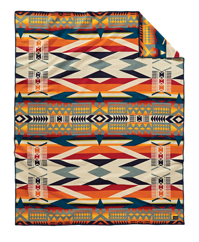 These blankets are 64 in.x 80 in. otherwise known as robe size, the size preferred by Native Americans for ceremonial purposes and wrapping about oneself as a robe. They are impressive as wall hangings and practical when folded on a sofa or at the foot of a bed. Felt bound. 82% pure virgin wool/18% cotton. Unnapped.
