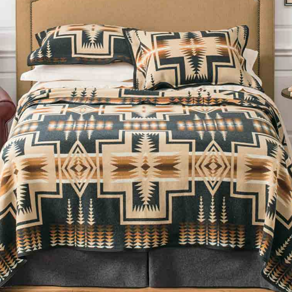 One of our most popular designs ever, crafted of USA-made wool in our Pendleton, Oregon mill. In 1923, President Warren Harding and his wife Florence came west to dedicate a portion of the old Oregon Trail. At the ceremony, local chiefs presented the first lady with a Pendleton shawl inspired by our famous Chief Joseph blanket. This dynamic design was an instant hit and remains in production today. "Absolutely gorgeous," says one customer. Pair with matching sham.