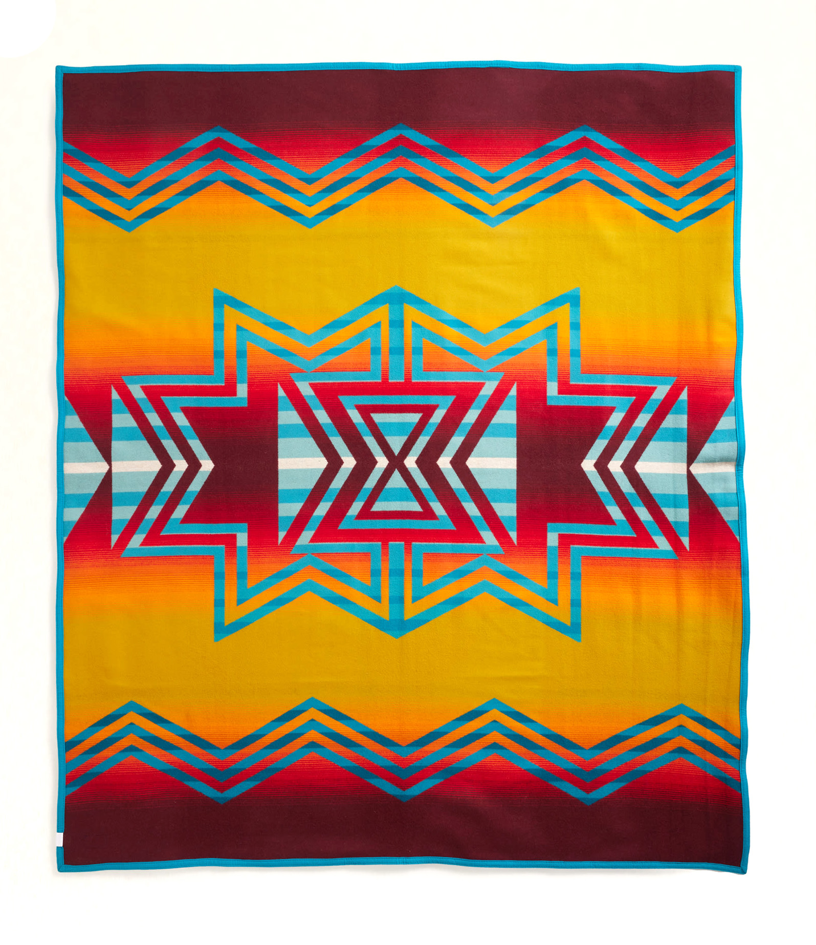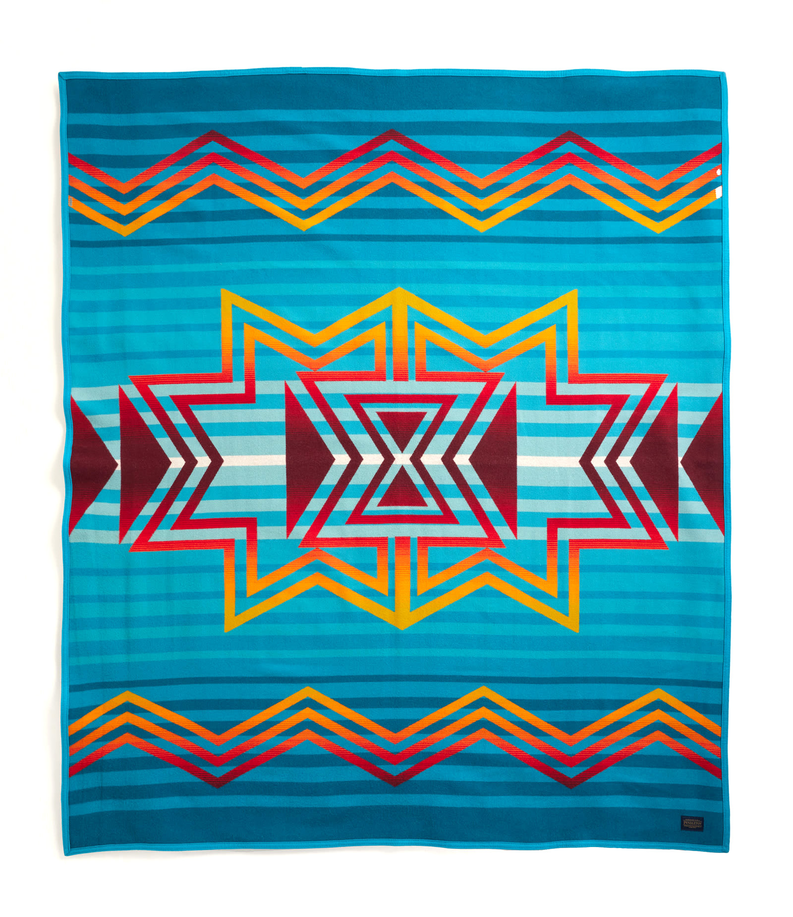 This blanket's design pays tribute to the Indigenous person representing more than one tribe. An hourglass shape evokes the matriarchal society of the Navajo, a serape layout honors the Yaqui, and turquoise symbolizes the Pueblo of Laguna—the Many Nations of the artist, Dustin Lopez. Woven from pure virgin wool in our Pendleton, Oregon, mill.