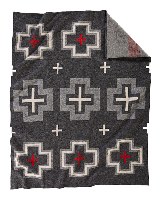 Bold crosses and minimalist colors are inspired by the influence of 19th century Spanish missionaries on Southwest weaving. Reverses from grey background to ivory for two dramatically different looks. Made in the USA.
