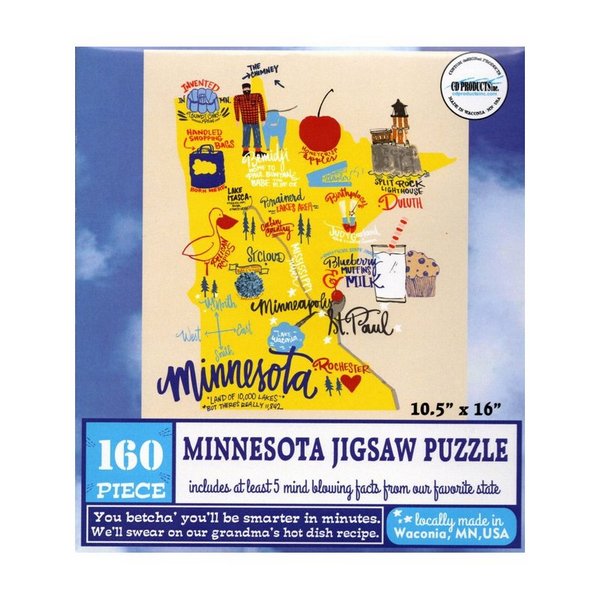 Minnesota Jigsaw Puzzle. Includes at least 5 mind blowing facts from our favorite state. You betcha' you'll be smarter in minutes. We'll swear on our grandma's hot dish recipe. 160 piece.