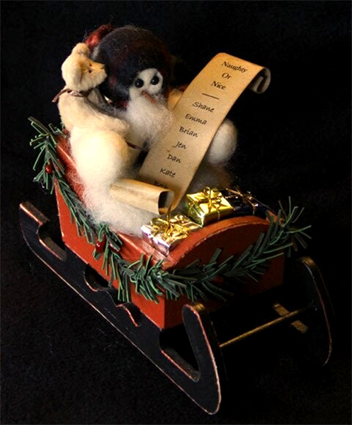Personalize this Wooly® Primitive Snowman Santa Claus with the names in your family (grandkids, friends, office staff, etc.). Please carefully spell the names in the order you wish to see on the list. Order individually, unless you want multiples of the same list of names for all. Limit of 50 names or so. Call if more needed or with any questions. This collectible custom Wooly® Snowman figurine makes a very unique gift for friends and family. It's a perfect addition to your snowman collection and winter décor. All Wooly® Primitive Snowmen decorations are made from real wool and are handcrafted in the United States.